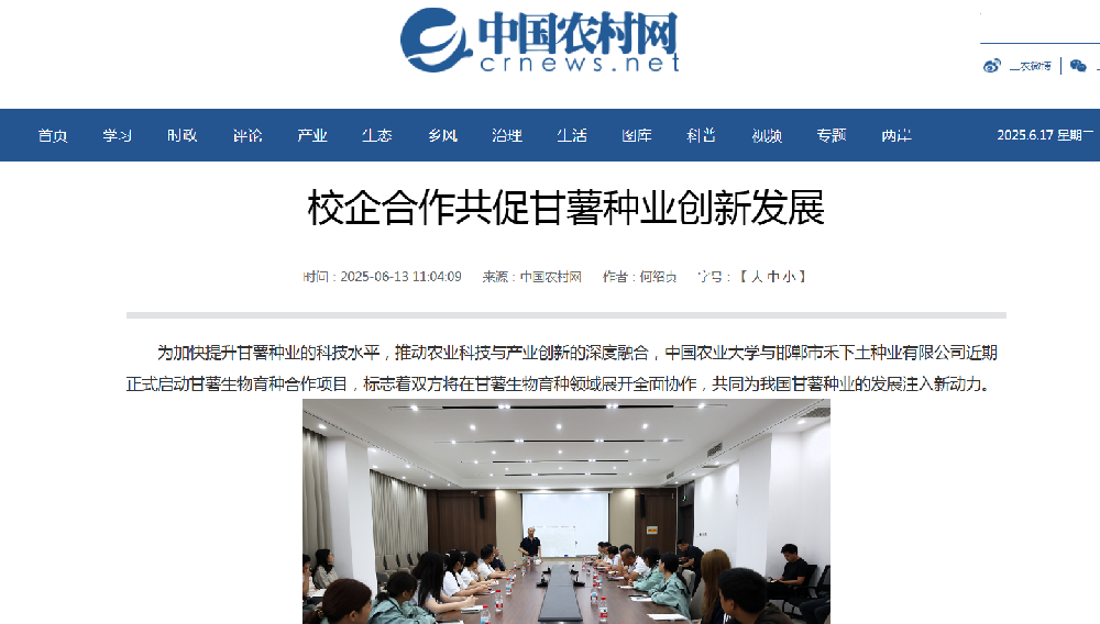 2025年6月13日,中國農(nóng)村網(wǎng)刊發(fā)《校企合作共促甘薯種業(yè)創(chuàng)新發(fā)展》,報(bào)道中國農(nóng)業(yè)大學(xué)與邯鄲市禾下土種業(yè)有限公司合作開展甘薯生物育種項(xiàng)目,全文如下:為加快提升甘薯種業(yè)的科技水平,推動農(nóng)業(yè)科技與產(chǎn)業(yè)創(chuàng)新的深度融合,中國農(nóng)業(yè)大學(xué)與邯鄲市禾下土種業(yè)有限公司近期正式啟動甘薯生物育種合作項(xiàng)目,標(biāo)志著雙方將在甘薯生物育種領(lǐng)域展開全面協(xié)作,共同為我國甘薯種業(yè)的發(fā)展注入新動力。從現(xiàn)在起到2035年,雙方將圍繞“甘薯生物育種”這一核心,在前沿技術(shù)研發(fā)、研發(fā)平臺共建、專業(yè)人才培養(yǎng)以及科技成果轉(zhuǎn)化等多個(gè)方面開展深入合作。通過構(gòu)建“以高校為科技支撐,以企業(yè)為創(chuàng)新主體”的校企合作新模式,致力于推進(jìn)新一代生物技術(shù)在甘薯種業(yè)領(lǐng)域的創(chuàng)新應(yīng)用,力求在甘薯品種改良、產(chǎn)量提升、品質(zhì)優(yōu)化等方面取得顯著成果。2025年6月9日至1...