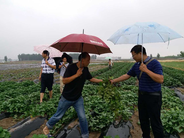 2017年6月22日,河北省農(nóng)科院糧油作物研究所甘薯室主任、京津冀甘薯聯(lián)合鑒定試驗(yàn)負(fù)責(zé)人馬志民冒雨到禾下土甘薯新品種試驗(yàn)基地調(diào)研,邯鄲市禾下土種業(yè)有限公司總經(jīng)理崔伏喜陪同參觀。