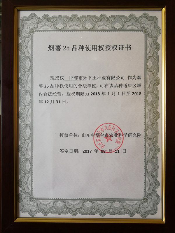 2017年9月11日,邯鄲市禾下土種業(yè)有限公司與煙臺(tái)市農(nóng)業(yè)科學(xué)院在山東煙臺(tái)簽定"煙薯25"甘薯品種使用權(quán)許可合同,有效日期15年。