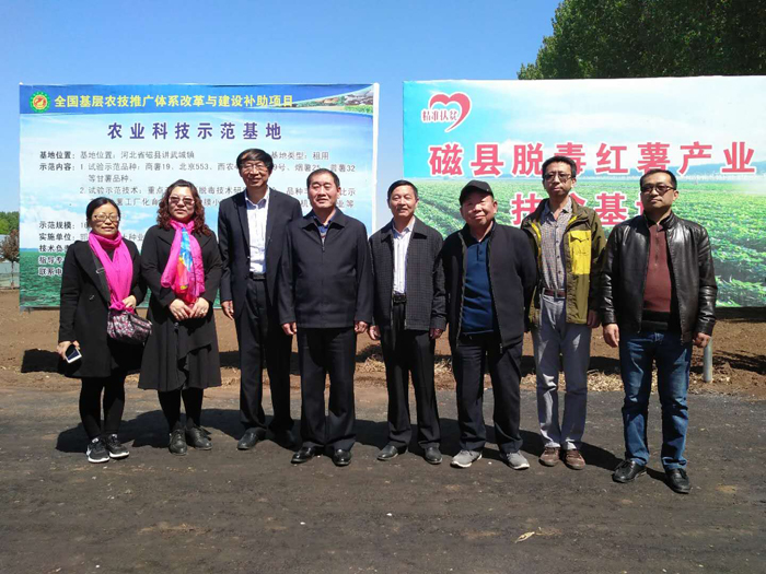 2019年4月14日,原河北省農(nóng)業(yè)廳正廳級巡視員張文軍、河北省農(nóng)業(yè)產(chǎn)業(yè)協(xié)會會長孫悅明、河北省農(nóng)業(yè)產(chǎn)業(yè)協(xié)會書記、常務(wù)副會長莊偉、河北省農(nóng)業(yè)產(chǎn)業(yè)協(xié)會常務(wù)副會長、秘書長聶永生、河北省農(nóng)業(yè)產(chǎn)業(yè)協(xié)會駐會副會長張立學(xué)、河北省農(nóng)業(yè)產(chǎn)業(yè)協(xié)會組織發(fā)展部部長鄭雪明等一行7人到禾下土脫毒甘薯種苗產(chǎn)業(yè)基地進(jìn)行調(diào)研。邯鄲市禾下土種業(yè)有限公司總經(jīng)理崔伏喜陪同調(diào)研。調(diào)研團(tuán)一行參觀了脫毒紅薯種苗生產(chǎn)基地,了解脫毒種苗生產(chǎn)流程,一起探討了脫毒甘薯產(chǎn)業(yè)發(fā)展重要性。張文軍專家談到:"甘薯育種是甘薯產(chǎn)業(yè)的"芯片",禾下土脫毒紅薯種苗基地的發(fā)展是在技術(shù)支撐下的產(chǎn)業(yè),甘薯全產(chǎn)業(yè)鏈發(fā)展是穩(wěn)定發(fā)展、提高競爭力的關(guān)鍵"。
