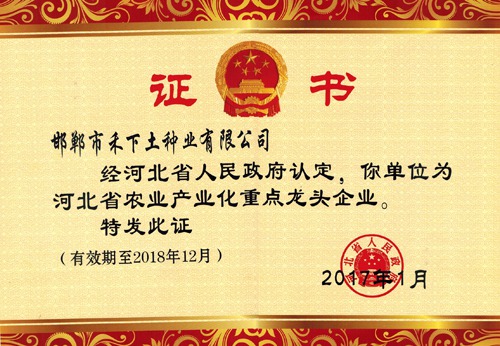 2017年邯鄲市禾下土種業(yè)有限公司被河北省人民政府授予河北省農(nóng)業(yè)產(chǎn)業(yè)化重點(diǎn)龍頭企業(yè),此項(xiàng)榮譽(yù)是河北省人民政府對(duì)禾下土種業(yè)長(zhǎng)期以來在農(nóng)業(yè)科研、技術(shù)創(chuàng)新、產(chǎn)業(yè)化發(fā)展、服務(wù)帶動(dòng)等方面給予的充分肯定,也進(jìn)一步堅(jiān)定了禾下土加快農(nóng)業(yè)產(chǎn)業(yè)化發(fā)展的信心與步伐。禾下土種業(yè)自2002年成立以來,發(fā)展了脫毒甘薯、小麥良種繁育、磁州白蓮藕三大農(nóng)業(yè)產(chǎn)業(yè)、建立了三個(gè)規(guī)?;F(xiàn)代農(nóng)業(yè)示范基地。其中,以脫毒甘薯產(chǎn)業(yè)為核心,建立起1個(gè)現(xiàn)代化脫毒組培擴(kuò)繁中心、1000畝脫毒甘薯種薯生產(chǎn)基地、500畝脫毒甘薯種苗繁育基地、10000畝脫毒甘薯高產(chǎn)示范基地。已完成26個(gè)甘薯品種的脫毒組培,制定了二十余項(xiàng)標(biāo)準(zhǔn)生產(chǎn)操作規(guī)程和4項(xiàng)專利申請(qǐng),實(shí)現(xiàn)了集科研、育種、育苗、生產(chǎn)、儲(chǔ)藏、銷售的一體化發(fā)展目標(biāo)。年產(chǎn)高代脫毒種苗2.5億株,營(yíng)銷網(wǎng)絡(luò)覆蓋河北、河...