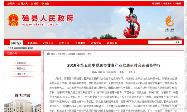 2018年1月8日,第五屆中原脫毒甘薯產(chǎn)業(yè)發(fā)展研討會在河北磁縣溢泉湖隆重舉行。得到各大報(bào)紙、網(wǎng)絡(luò)媒體的關(guān)注。