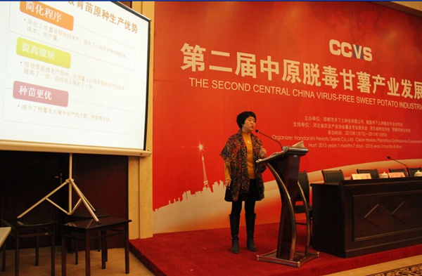參觀結(jié)束后,邯鄲市禾下土種業(yè)有限公司董事長向與會(huì)專家、企業(yè)、種植大戶介紹了禾下土公司自1990年至今,在農(nóng)技服務(wù)、農(nóng)資經(jīng)營、土地規(guī)?;?jīng)營、特色農(nóng)業(yè)產(chǎn)業(yè)化帶動(dòng)和團(tuán)隊(duì)建設(shè)等方面所取得的成績。介紹了禾下土脫毒甘薯組培中心整體建設(shè)情況,和"禾下土脫毒甘薯二級(jí)育苗生產(chǎn)流程",展示了龍薯9號(hào)、商薯19、徐薯22、鄂薯6號(hào)、徐薯32、徐薯34、心香、西農(nóng)431、北京553、遺字138、秦薯8號(hào)等20余個(gè)已完成的脫毒甘薯品種及產(chǎn)量表現(xiàn)。介紹了脫毒甘薯產(chǎn)業(yè)基地在土地輪換、屏障隔離、規(guī)范管理、集中生產(chǎn)、定期防治、標(biāo)準(zhǔn)儲(chǔ)藏六項(xiàng)標(biāo)準(zhǔn)化種薯繁育生產(chǎn)流程。和大棚建設(shè)現(xiàn)代化、種苗質(zhì)量統(tǒng)一化、田間管理責(zé)任化、出庫入庫規(guī)范化、種苗銷售品牌化、物流配送信息化六項(xiàng)現(xiàn)代化脫毒種苗生產(chǎn)流程,展示了禾下土萬畝脫毒甘薯(商品薯)基地的區(qū)位、土壤、環(huán)境三大生產(chǎn)優(yōu)勢,并分享了禾下土公司、禾下土合作社多年來所取得的榮譽(yù)和影響力,得到與會(huì)專家、企業(yè)、種植大戶的充分肯定、贊賞。