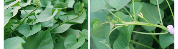 4、栽插方法:選用無病的脫毒紅薯苗壯苗栽種。地膜覆蓋一般采用先栽苗后腹膜的方式。水肥地采用水平栽法,旱地則用斜栽法,將薯苗平躺埋入,外面只留三葉一心。