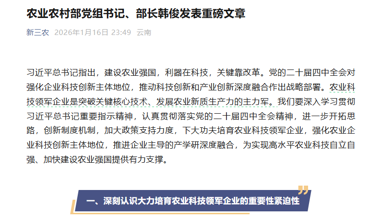 近日,《農(nóng)村工作通訊》2025年第24期刊發(fā)農(nóng)業(yè)農(nóng)村部黨組書記、部長(zhǎng)韓俊重磅文章《大力培育農(nóng)業(yè)科技領(lǐng)軍企業(yè)》。文章深入闡釋了培育農(nóng)業(yè)科技領(lǐng)軍企業(yè)、強(qiáng)化企業(yè)科技創(chuàng)新主體地位的重要意義與實(shí)踐路徑,為農(nóng)業(yè)科技企業(yè)高質(zhì)量發(fā)展指明方向、提供遵循?,F(xiàn)將全文轉(zhuǎn)發(fā)如下:習(xí)近平總書記指出,建設(shè)農(nóng)業(yè)強(qiáng)國(guó),利器在科技,關(guān)鍵靠改革。黨的二十屆四中全會(huì)對(duì)強(qiáng)化企業(yè)科技創(chuàng)新主體地位,推動(dòng)科技創(chuàng)新和產(chǎn)業(yè)創(chuàng)新深度融合作出戰(zhàn)略部署。農(nóng)業(yè)科技領(lǐng)軍企業(yè)是突破關(guān)鍵核心技術(shù)、發(fā)展農(nóng)業(yè)新質(zhì)生產(chǎn)力的主力軍。我們要深入學(xué)習(xí)貫徹習(xí)近平總書記重要指示精神,認(rèn)真貫徹落實(shí)黨的二十屆四中全會(huì)精神,進(jìn)一步開拓思路,創(chuàng)新制度機(jī)制,加大政策支持力度,下大功夫培育農(nóng)業(yè)科技領(lǐng)軍企業(yè),強(qiáng)化農(nóng)業(yè)企業(yè)科技創(chuàng)新主體地位,推進(jìn)企業(yè)主導(dǎo)的產(chǎn)學(xué)研深度融合,為實(shí)...
