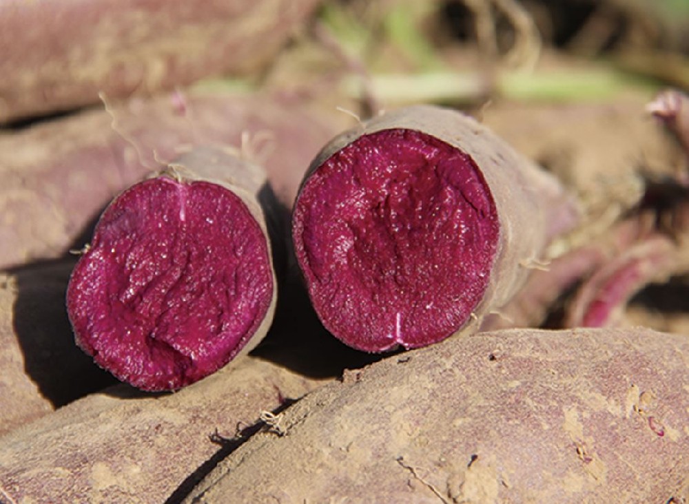 鮮食型甘薯品種,中長(zhǎng)薯,數(shù)塊條形,薯皮紫紅色,薯肉紫色,結(jié)薯集中整齊,干物率33.44%,鮮薯花青素含量為20.46mg/100g。抗甘薯蔓割病、根腐病、黑斑病,耐儲(chǔ)存性好。一般畝產(chǎn)鮮薯2000公斤左右。